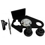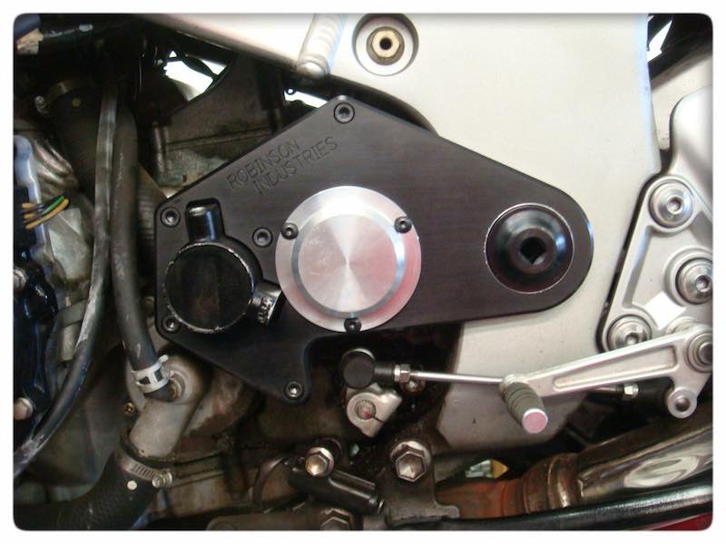 The output shaft support has a round steel anchor that is bolted to the swingarm pivot. The plate slides over the steel anchor and bolts to the cases with the bolts provided. An extended snout countershaft sprocket bolt then rides in the bearing fitted to the plate. This supports the end of the transmission output shaft preventing broken shafts and engine cases. A longer clutch pushrod is included. The output shaft support can be used with hand or slider clutches. If you have a “grudge bike” you need one of these!